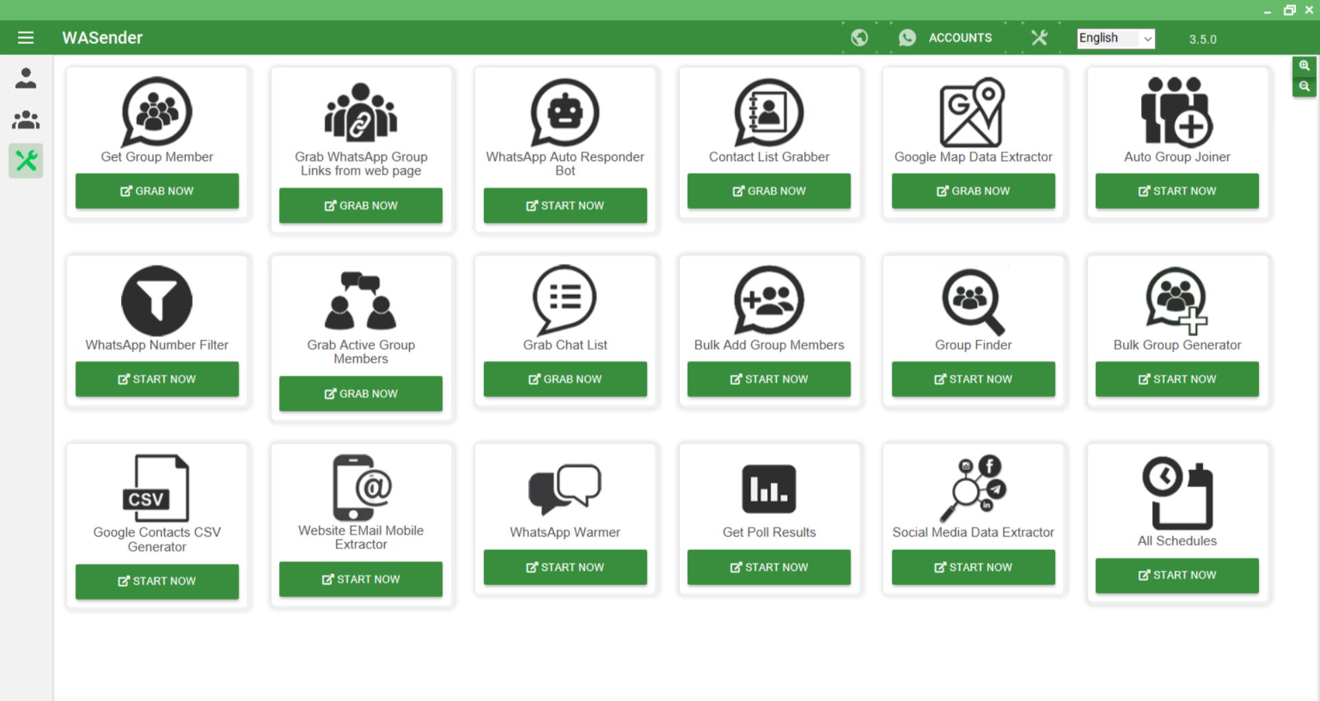 the latest version of WASender (3.5.0) latest version of WhatsApp marketing tool that allows you to send bulk messages to people and groups, grab group members, and more.